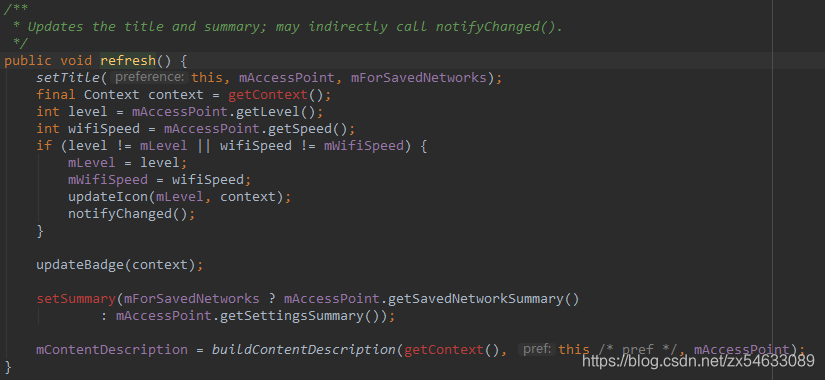 这个方法最后会调用preference.refresh()刷新状态。我们进入AccessPointPreference中去看下refresh()。