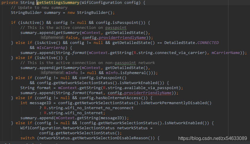 从这边可以看到summary是从accessPoint中获取的。forSavedNetworks是表示是否是已保存网络界面,这里调用的是AccessPoint的getSettingsSummary