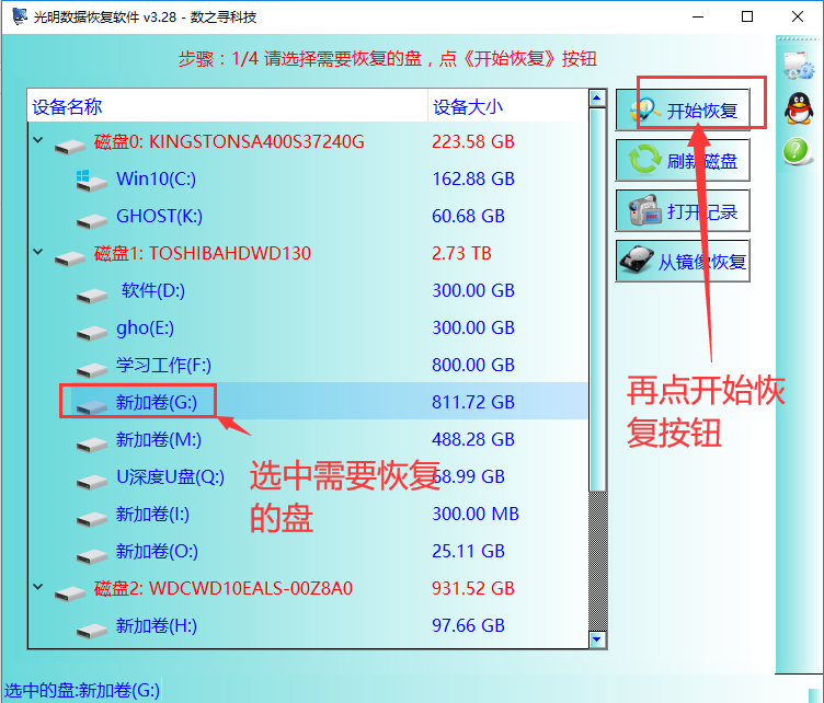 步骤1:先下载并解压程序运行后,选中需要恢复的盘,然后点《开始恢复》按钮