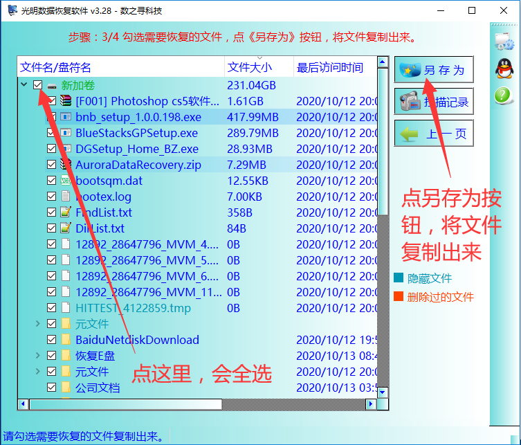 步骤3:将想要恢复的文件打钩,接着点右上角的保存,《另存为》按钮,将打钩的文件拷贝出来。