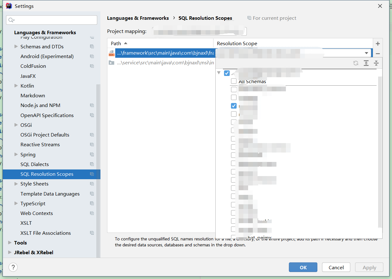 找到 File->Settings->Languages&Frameworks->SQL Resolution Scopes