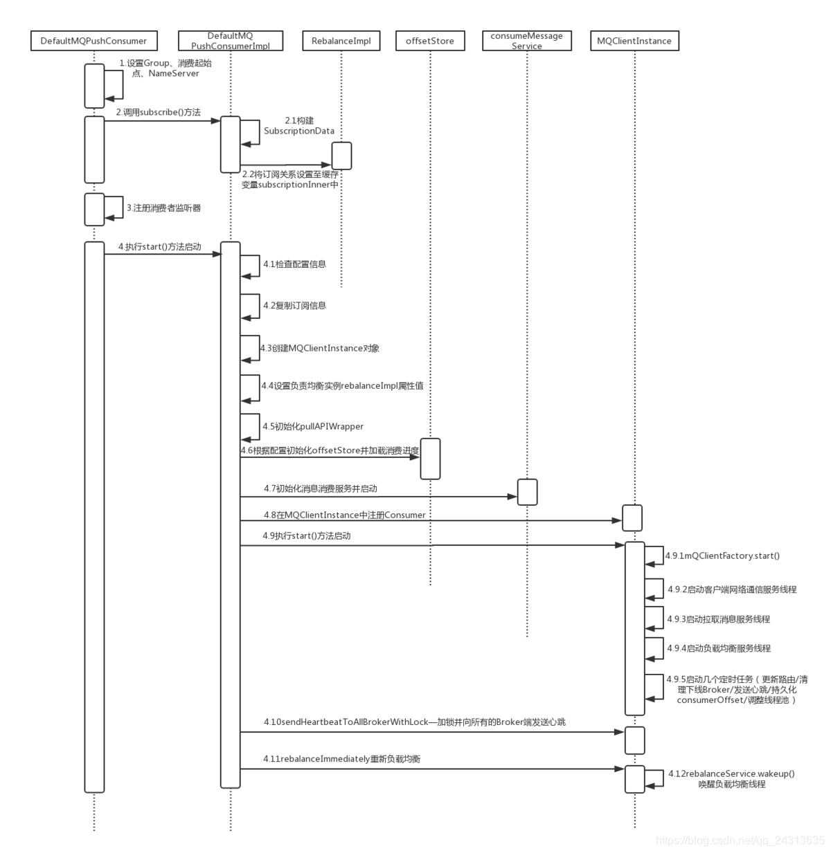 从上面的时序图上可以看出,Push方式的Consumer启动流程完成的任务比较多,主要任务如下: