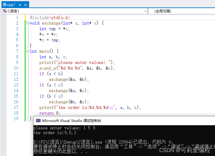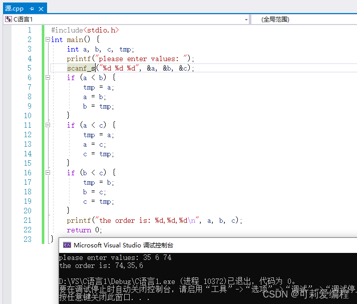 printf("the order is:%d,%d,%d\n", a, b, c);