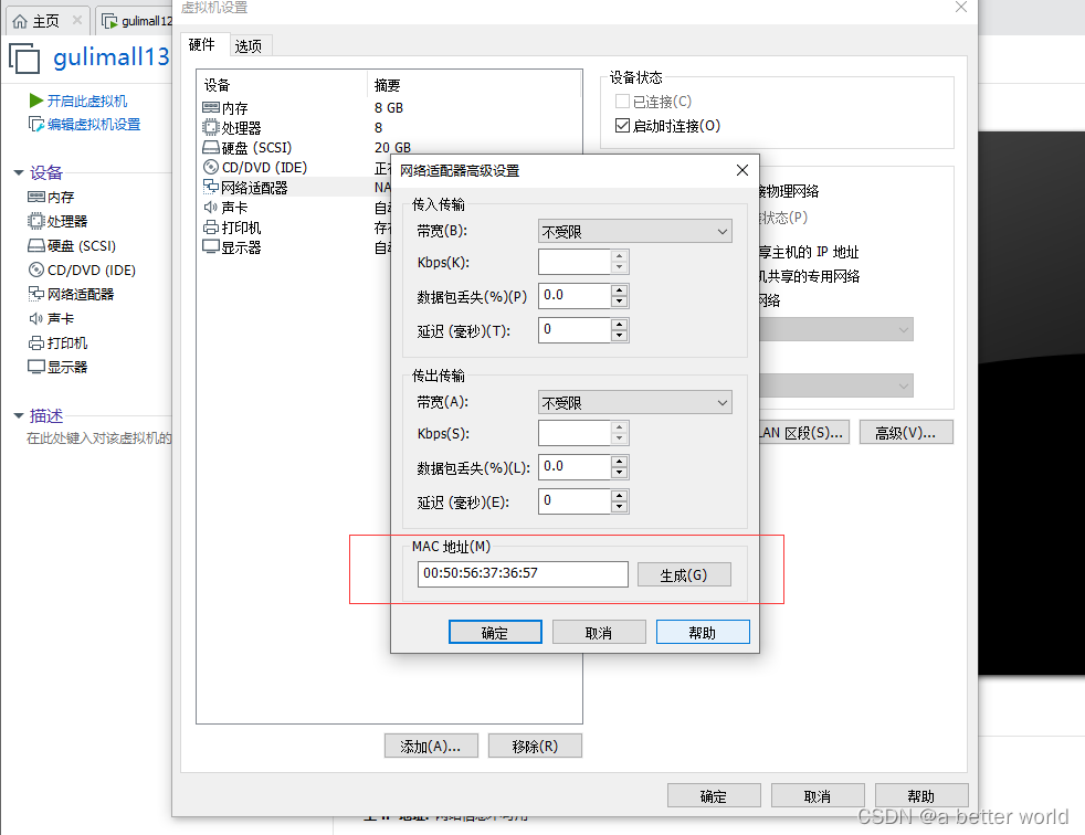 1. 移除网络适配器,添加新的网络适配器并生成新的mac地址。