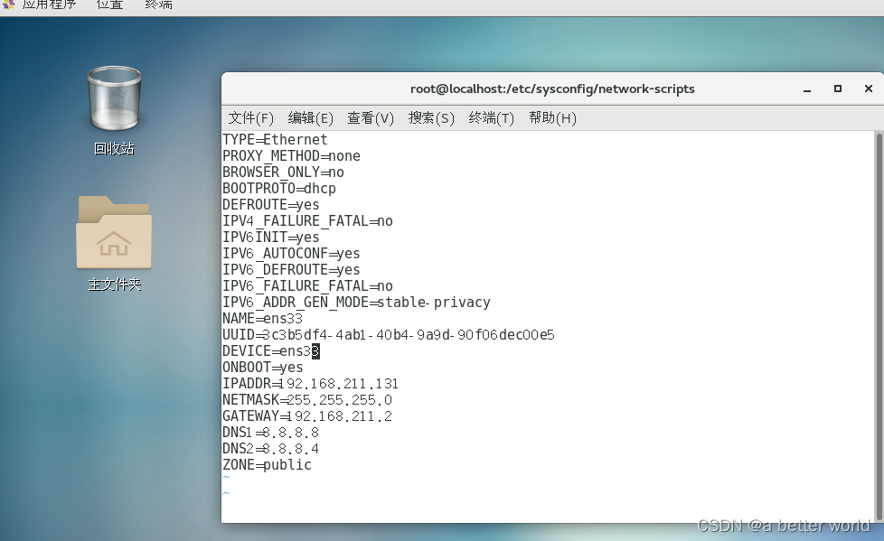vi /etc/sysconfig/network-scripts/ifcfg-ens33
