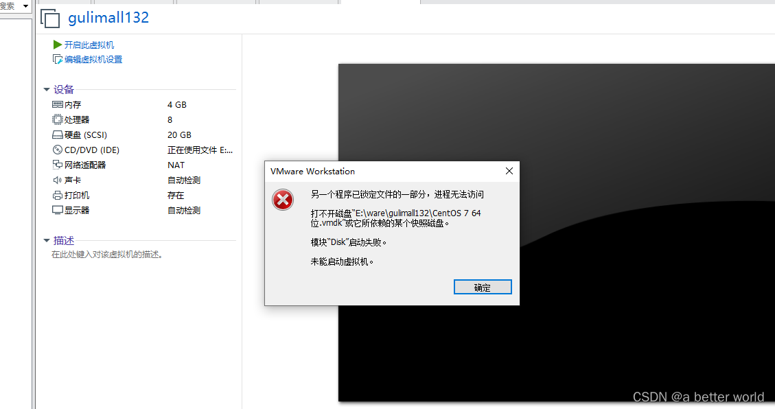 注意复制Linux虚拟机镜像时需要关闭原有Linux虚拟机,否则会报如下错误: