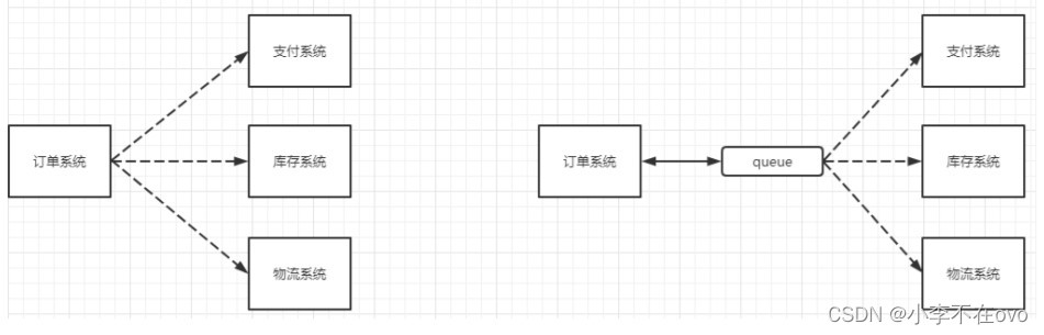 以电商应用为例,应用中有订单系统、库存系统、物流系统、支付系统。用户创建订单后,如果耦合 调用库存系统、物流系统、支付系统,任何一个子系统出了故障,都会造成下单操作异常。当转变成基于 消息队列的方式后,系统间调用的问题会减少很多,比如物流系统因为发生故障,需要几分钟来修复。在 这几分钟的时间里,物流系统要处理的内存被缓存在消息队列中,用户的下单操作可以正常完成。当物流 系统恢复后,继续处理订单信息即可,中单用户感受不到物流系统的故障,提升系统的可用性。