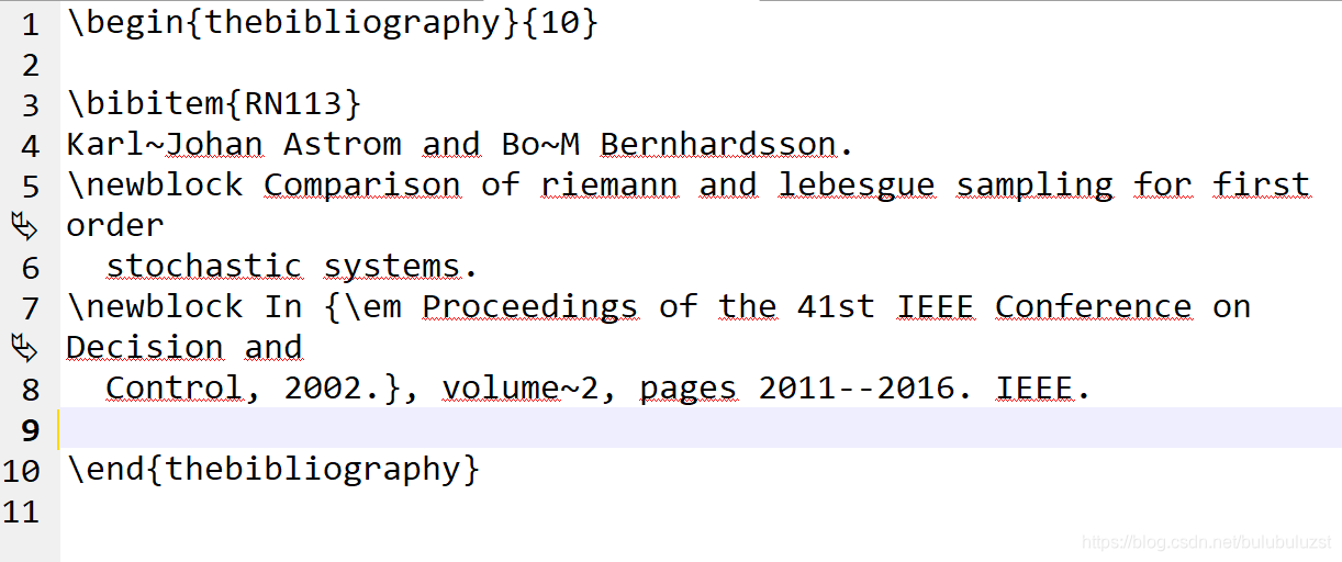 用TeXstudio打开bbl文件,如图为得到的bbl文件部分内容,复制到原文的参考文献部分即可(需要复制\begin{thebibliography}和end{thebibliography}以及中间的所有内容)。