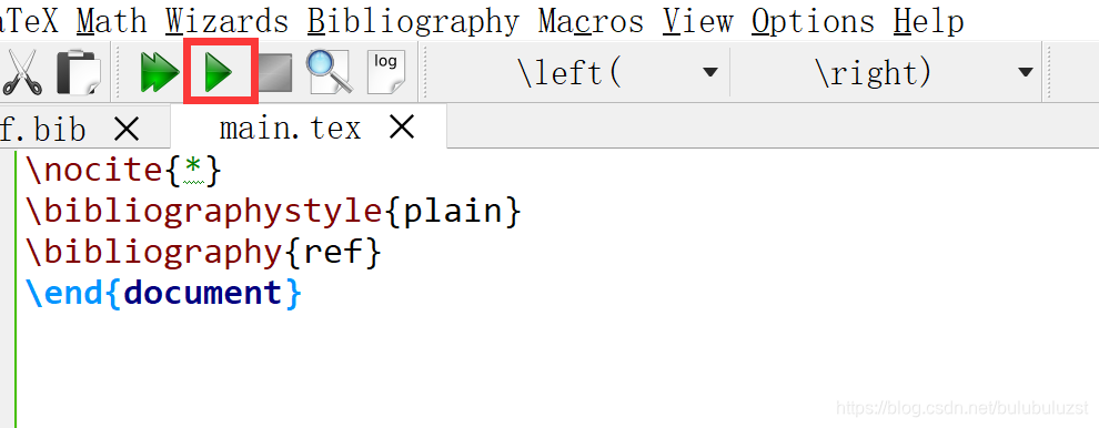 3.将前几个步骤生成的ref.bib和论文的main.tex文件放在同一个文件夹下,点击如图的小绿三角编译论文。(默认按照字母顺序排列,若想让参考文献按照引用顺序排列,把plain改成unsrt即可)