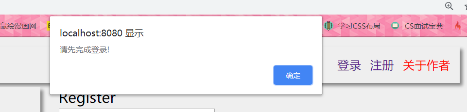 当我点击关注作者这个路由时,由于我们在这个路由中设置了requireAuth为true,并且此时用户没有登录,也就不会有token,所以这里弹出提示框。接着我们点击确定,此时我们看看路由变成了什么样子