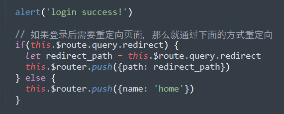 当登录成功的时候,我们需要判断是否需要重定向,也就是说判断当前的路由中是否有重定向的路由参数,也就是这个redirect,如果有的话,我们就通过this.$router.push()进行重定向,否则就将页面重定向到首页home中。