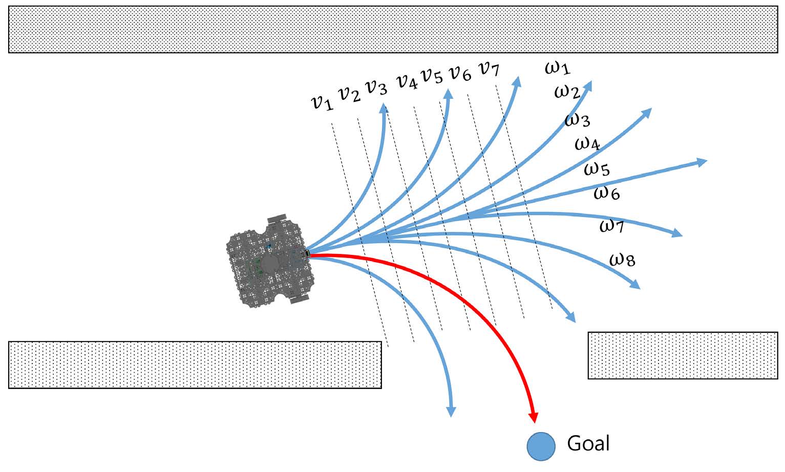 在这个动态窗口中,通过使用目标函数,获得满足条件的平移速度和旋转速度。满足条件意味着使考虑了机器人的方向、速度和碰撞的目标函数达到最大化。如果绘制出来,则如图所示,我们可以在各种和 中找到最优速度并移动机器人。
