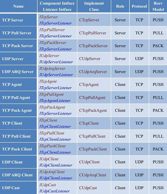- Client 组件:基于 Event Select / POLL 通信模型,每个组件对象创建一个通信线程 并管理一个 Socket 连接,适用于小规模客户端场景。