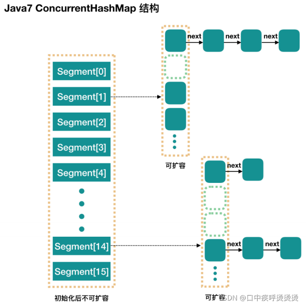 concurrencyLevel:并行级别、并发数、Segment 数,怎么翻译不重要,理解它。默认是 16,也就是说 ConcurrentHashMap 有 16 个 Segments,所以理论上,这个时候,最多可以同时支持 16 个线程并发写,只要它们的操作分别分布在不同的 Segment 上。这个值可以在初始化的时候设置为其他值,但是一旦初始化以后,它是不可以扩容的。再具体到每个 Segment 内部,其实每个 Segment 很像之前介绍的 HashMap,不过它要保证线程安全,所以处理起来要麻烦些。