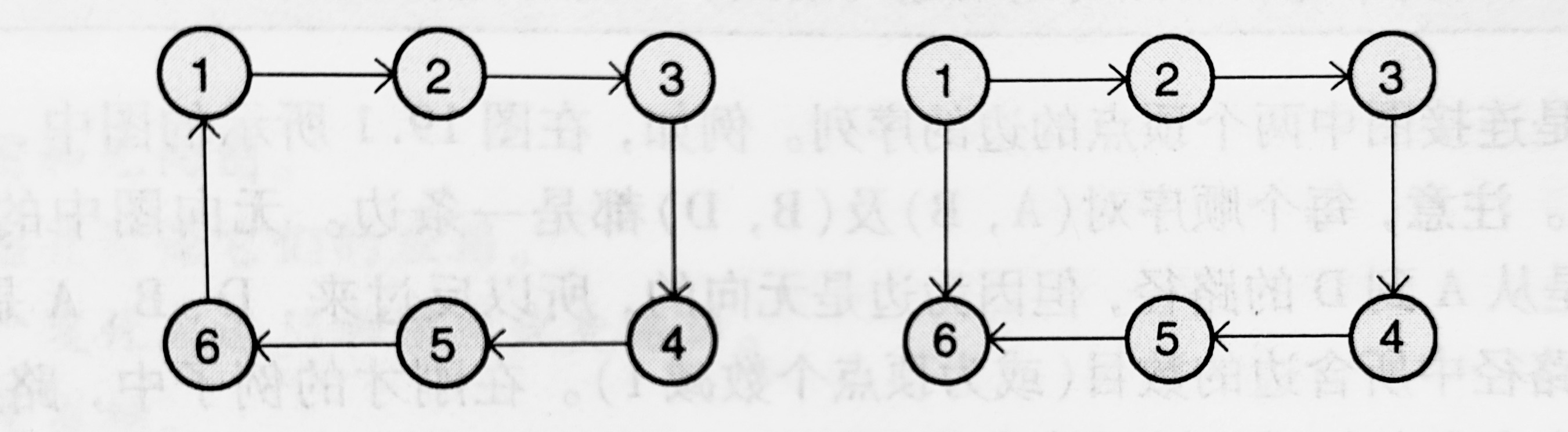 有向连通图的定义看上去与无向图中的定义一样,即有向图中任意两个顶点之间都有路径相连。但是对于有向图来说,路径的定义是不同的,下图中第一个图是连通的,第二个图是不连通的,因为从任何顶点到顶点1都没有路径。