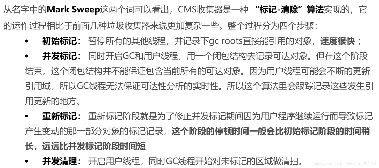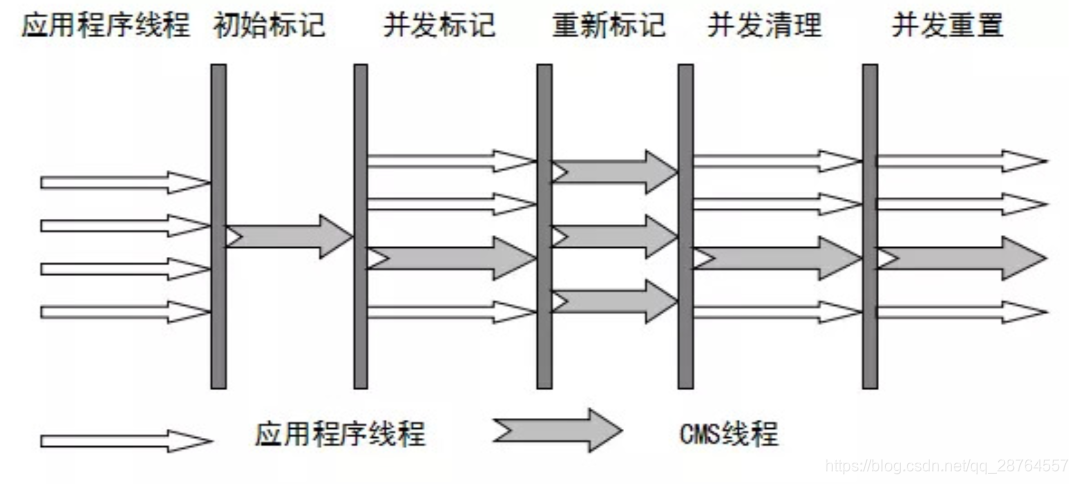 并发清理:并发清理过程中又产生了垃圾,不会清除,为浮动垃圾,下一次gc再去清理。