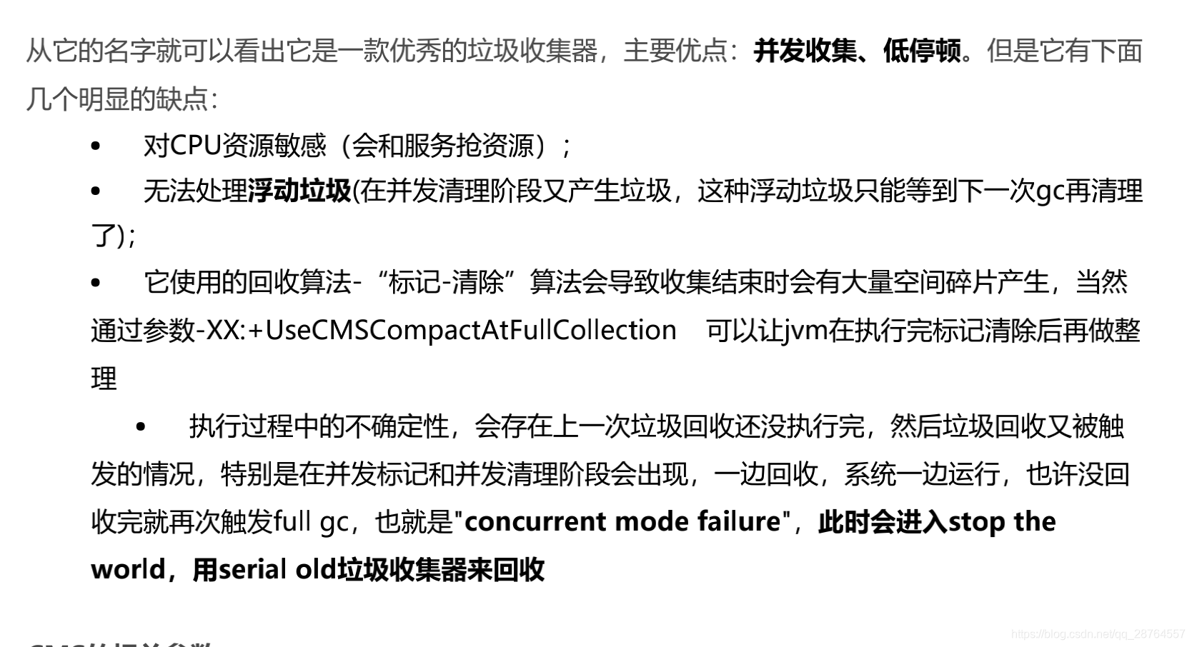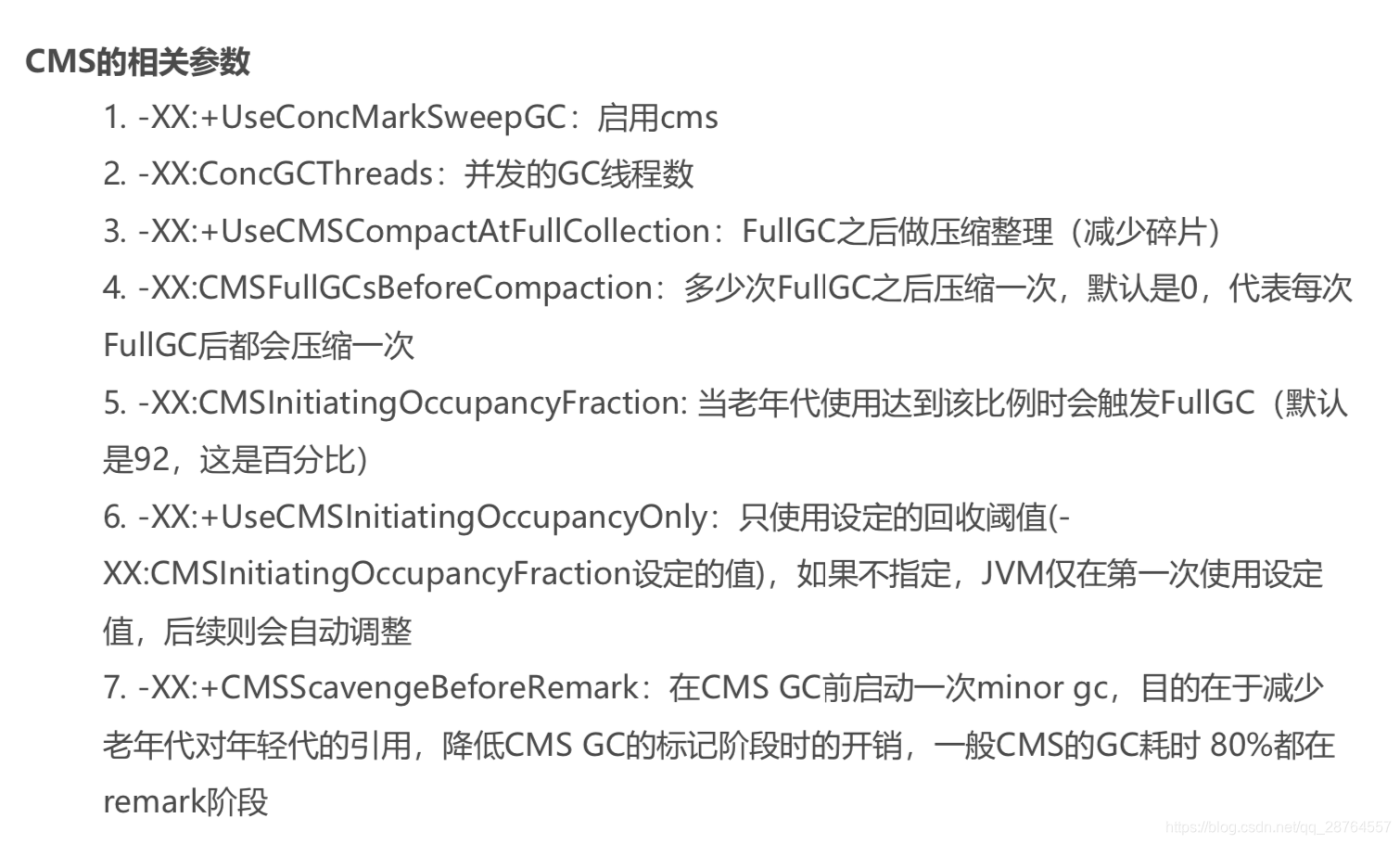 CMS的参数:启用 并发的线程数 fullGC后做压缩整理 多少次压缩之后做碎片整理 老年代使用多少会引发fullGC(在回收时间的回收次数之间的平衡) 只使用设定的阈值 CMS GC前启动一次minor gc(https://www.zhihu.com/question/61090975),最后一个是减少闭环遍历的对象。
