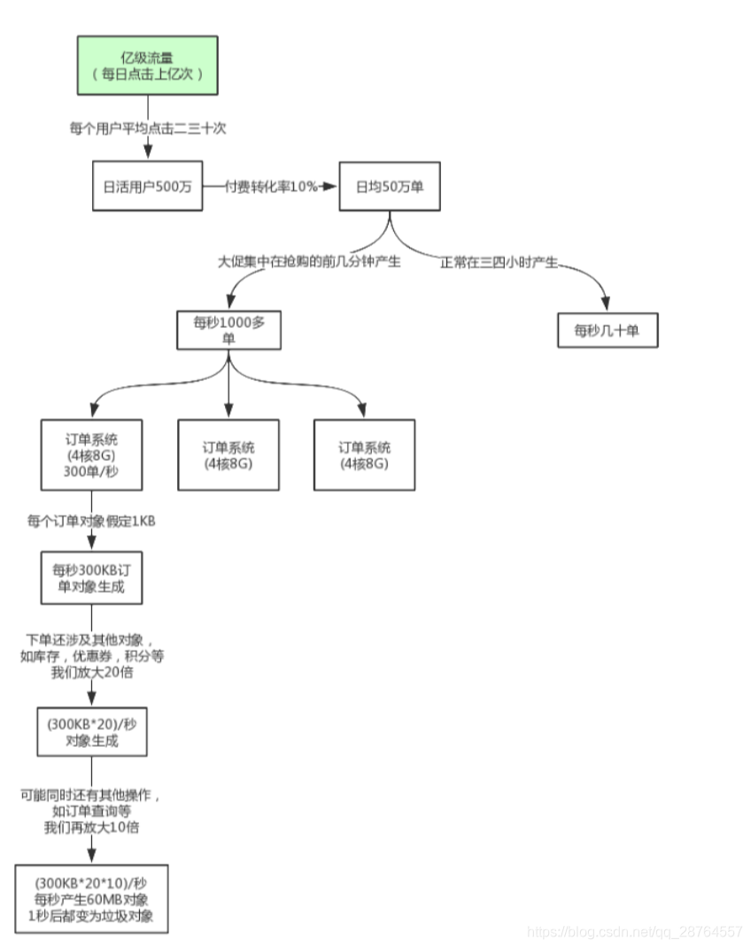 忽然业务暴增,每秒处理上千单,每次订单的时间变长,eden的回收只有百分之70。回收不掉一下子suirvivor代可能会有200M过来了,放不下,进老年代的多了。