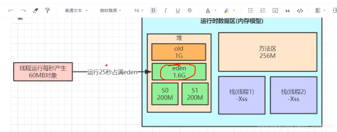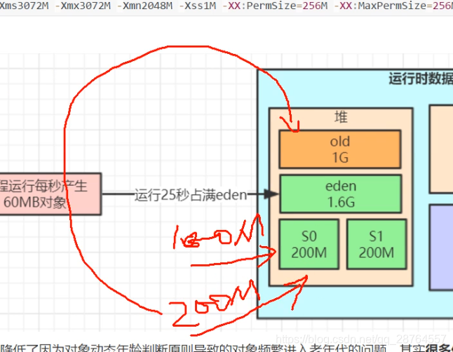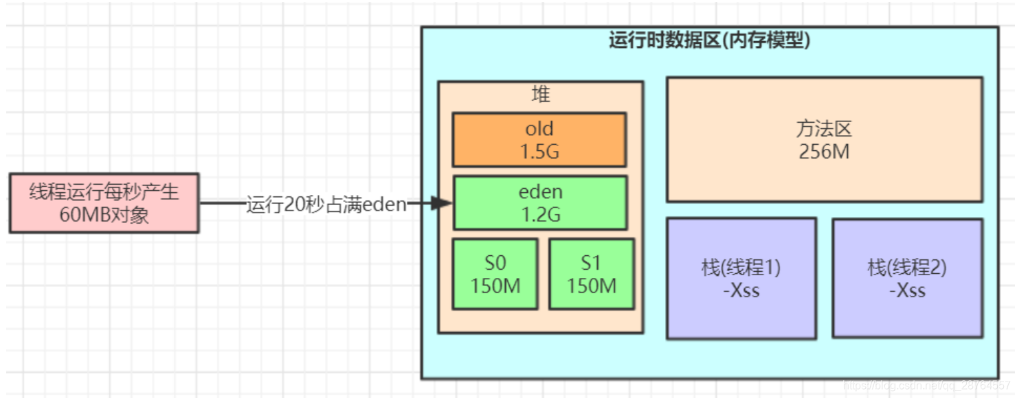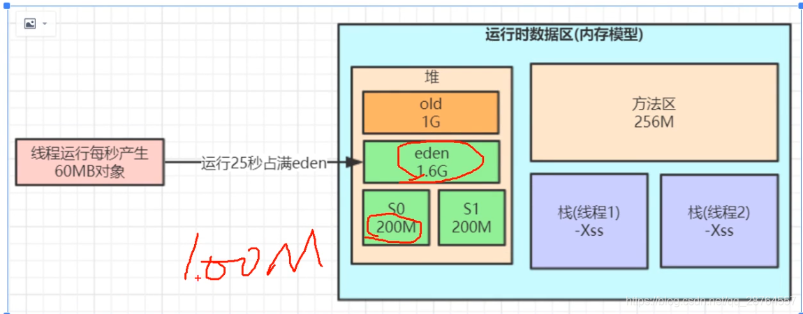 每秒60M则20s执行一次min gc。一般百分之95都被清除了。就是在回收之前的剩下的几秒没被清理。也就是100多M。会放在surviver区里面。