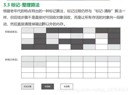 3.标记整理算法(老年代算法),就是整理到一边,整理过程中拦路的清除。