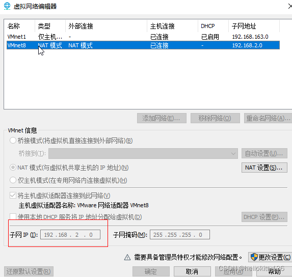 2、选择VMnet8,选择net模型,并将子网IP设置和主机同一个网段