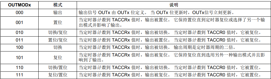 CCTL1 = OUTMOD_7; // CCR1为reset/set模式,CCR1时变为低电平,CCR0变为高电平