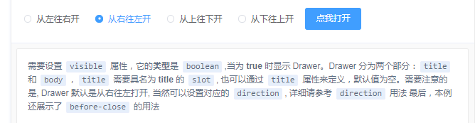 有些时候, Dialog 组件并不满足我们的需求, 比如你的表单很长, 亦或是你需要临时展示一些文档, Drawer 拥有和 Dialog 几乎相同的 API, 在 UI 上带来不一样的体验.