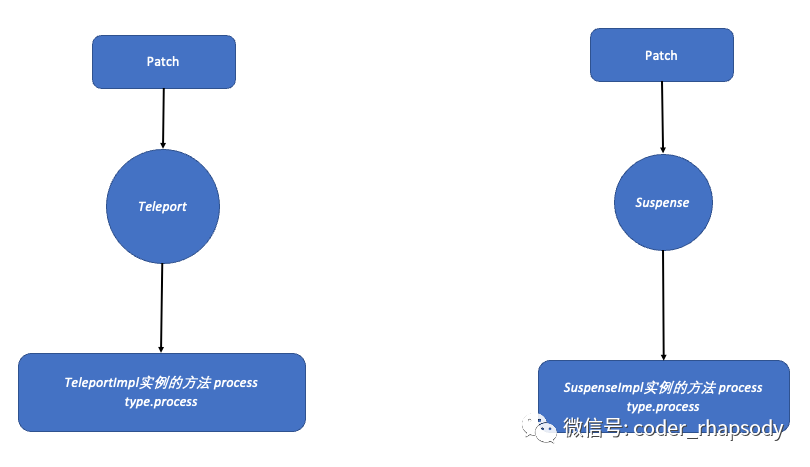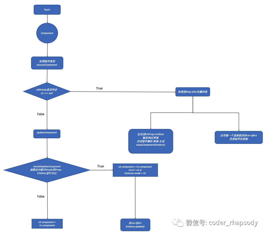 如果匹配到以上两种,会调用组件实例上的process方法 。porcess方法的主要逻辑与前面的相同 。首先会判断原有Vnode是否存在,不存在则mount,存在则patch