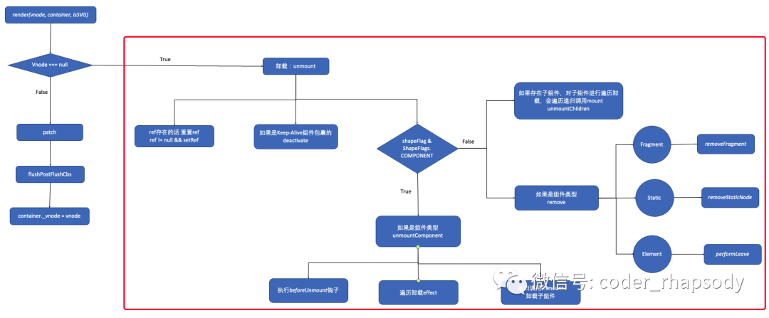 - 首先会判断Vnode是否存在,如果不存在,则调用unmount函数,进行组件的卸载