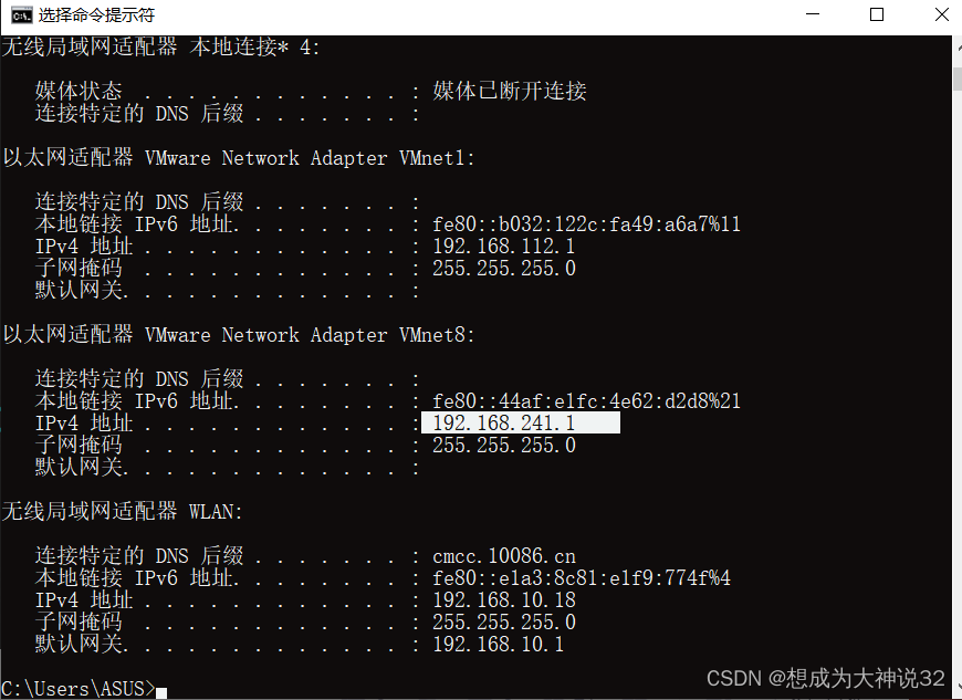 简单三步,我们的问题就解决了,现在我们再在主机中用ipconfig看一下
