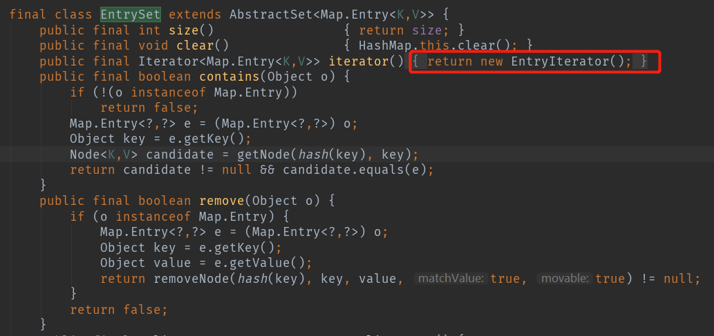 HashMap中有 transient Set<Map.Entry<K,V>> entrySet,并不进行添加操作,里面也不存储值,通过EntryIterator来遍历,如下图。