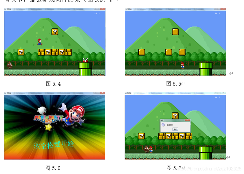 超级玛丽小游戏的JAVA程序,进入游戏后首先按空格键开始,利用方向键来控制的马里奥的移动,同时检测马里奥与场景中的障碍物和敌人的碰撞,并判断马里奥的可移动性和马里奥的生命值。当马里奥通过最后一个场景后游戏结束。。